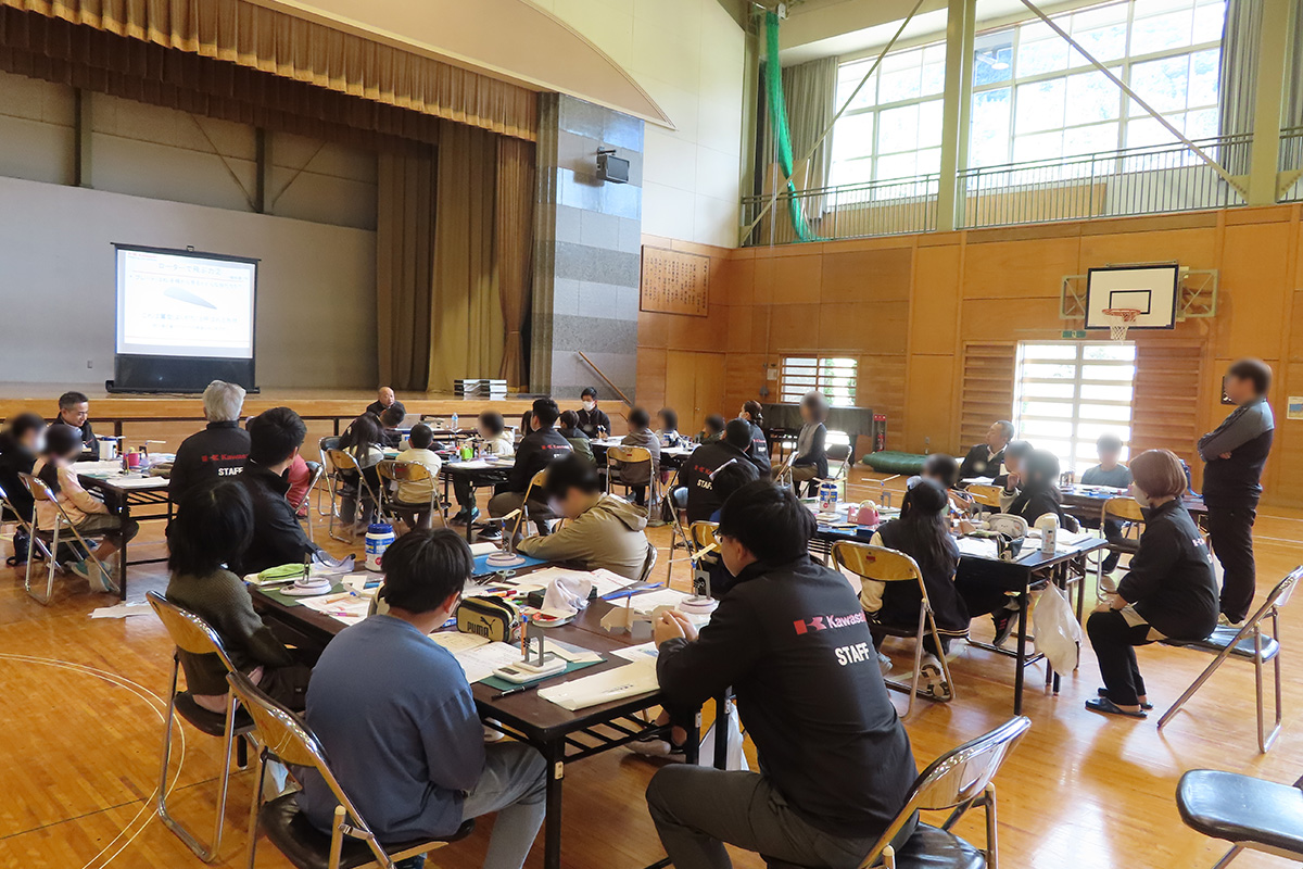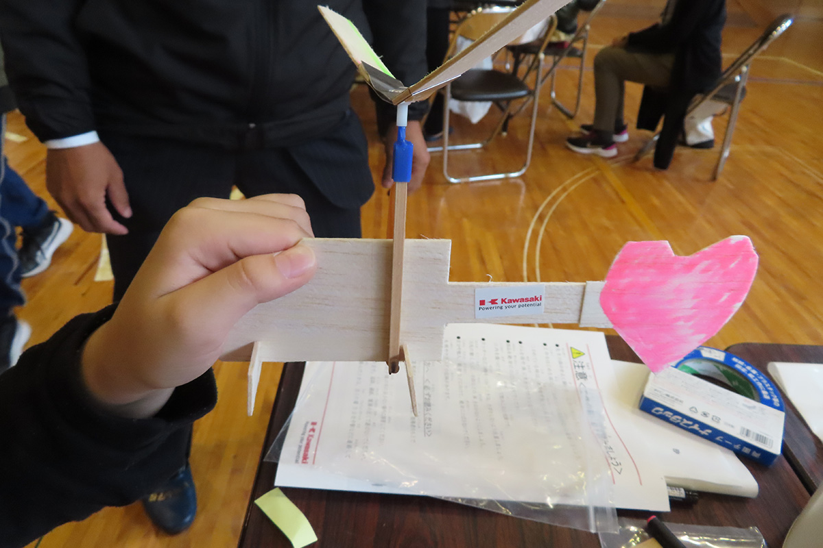 川崎重工業では、私たちの生活に身近な新幹線(はやぶさ、こまち等)、鉄道車両、バイク、調理・配膳等を行うロボットのほか、航空機(ブルーインパルス等)やヘリコプターといった様々な乗り物やロボットを作っていることを紹介した。工作・実験の「マイヘリコプターをつくろう!」では、実際のヘリコプターの大きさや飛ぶ仕組みなどを紹介したのち、工作キットを使いオリジナルのヘリコプターを制作し飛行させた。ヘリコプターを高く真っすぐ飛ばすためには「ローター(羽)の角度を変える」「ローターを翼型にする」「テイルローターを取り付けて安定させる」ことが重要であることを知り、工作・実験を通じてヘリコプターに使われている高度な技術について理解を深めた。