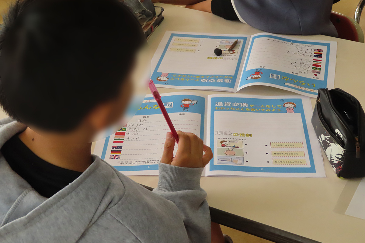 いろいろな国のお金や通貨について調べた後、グループ対抗の通貨交換ゲームを通じて国によって通貨単位が異なることや、円を他の通貨と交換するときの金額の違いについて学習した。また、講師から日本の「円」とアメリカの「ドル」、そして円高・円安について説明を受け、その後、輸入体験ゲームを行うことで理解を深めた。さらに、お金(円)の価値は世の中の変化によって変動するため、テレビや新聞などのニュースに関心を持つことが重要であると学んだ。