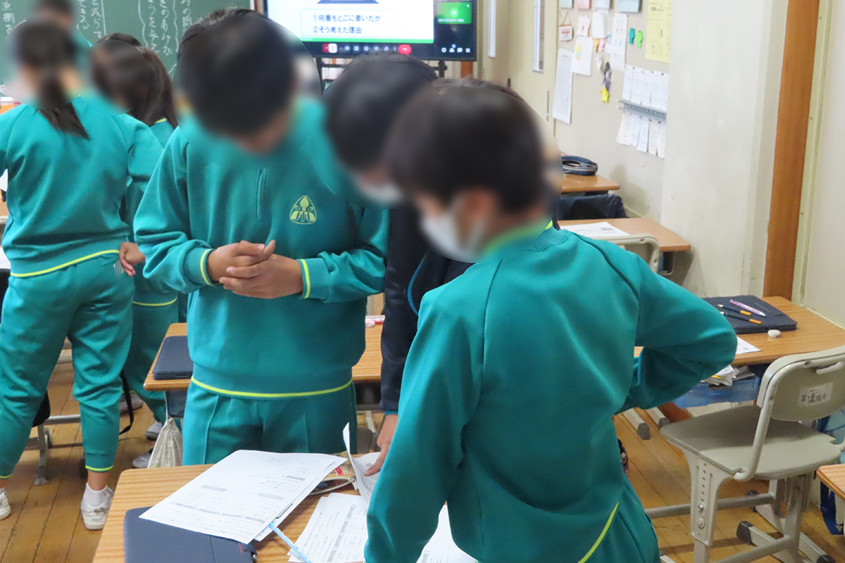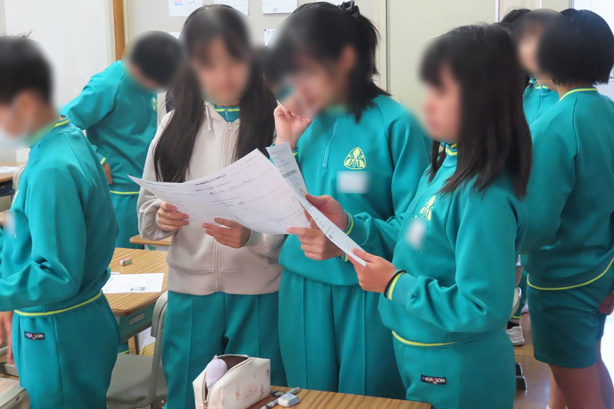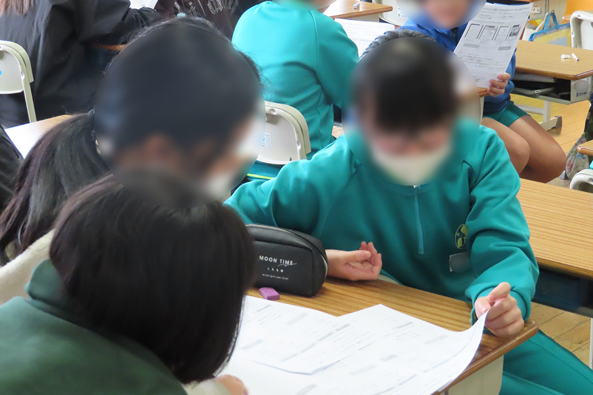 スマホやインターネットに潜むリスク(危険性)について、「リスクの発見」「リスクの見積もり」「リスクへの対応」の3つの段階(リスクを考えるための視点)に分けて考えた。4つの具体的な事例から、「自分に起こりそうなことはどれか」「起こったときの被害の大きさ」について、ワークシートを使って個人で考えた後、グループで話し合い、「自分」と「友だち」のリスクに対する捉え方や感じ方の違いについて理解を深めた。また、悩んだときや困ったときは、ひとりで抱え込まずに周囲の人に相談することの大切さについて学んだ。