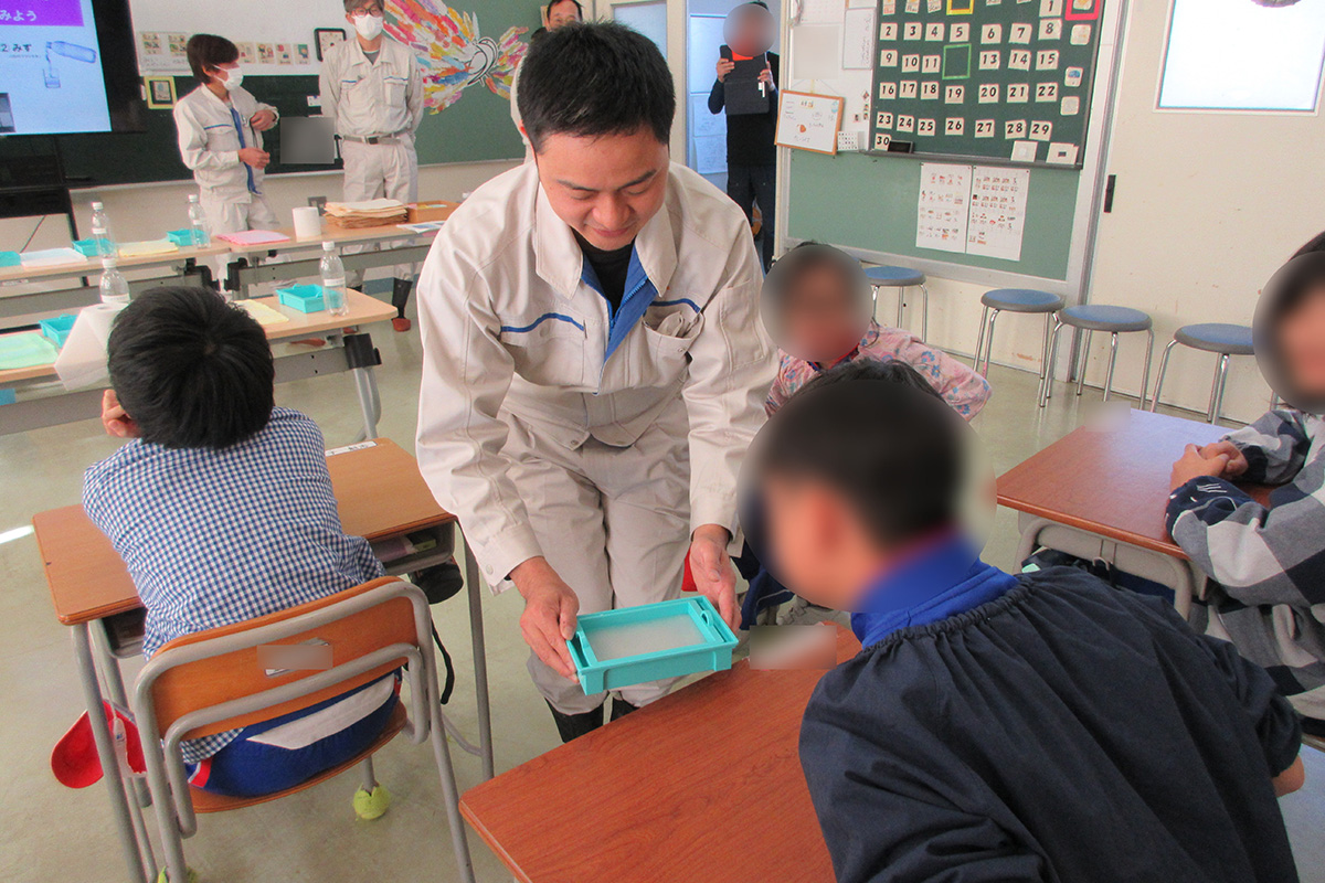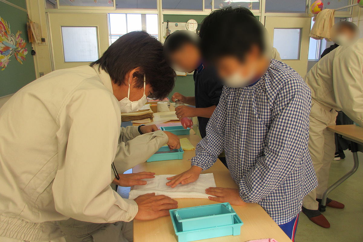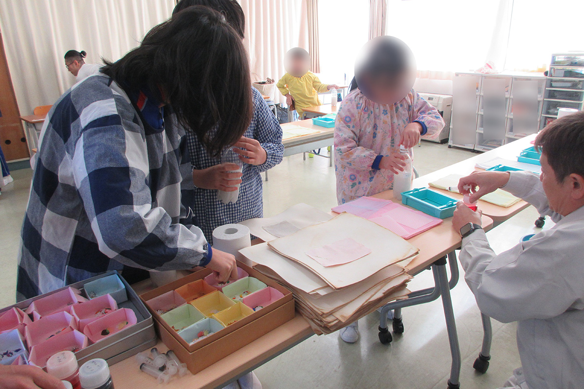 紙は木から作られており、木を細かく砕いた「木材チップ」を、南アフリカ、オーストラリア、チリ、ブラジル、ベトナムなどの海外から船で日本に運んでいることや、工場では木材チップと薬を混ぜて大きな鍋で煮る作業「蒸解(じょうかい)」をすることで、白い「パルプ」(紙のもとになる材料)になることを学習した。クイズや動画を通して紙の製造工程や製紙機械の仕組みについて理解を深めるとともに、実際に木材チップやパルプを固めたものを手に取り、紙の原料を直接確認した。紙をつくる機械は最大で長さ約230メートル、幅約10メートルの大きさであることも紹介された。手すき紙づくり体験では、ペットボトルに水と切ったトイレットペーパーを入れてよく振ったどろどろのバルブに染料を入れて好きな色にしたり、色紙で飾りつけをしたりして、自分だけのオリジナルの紙を作成した。
