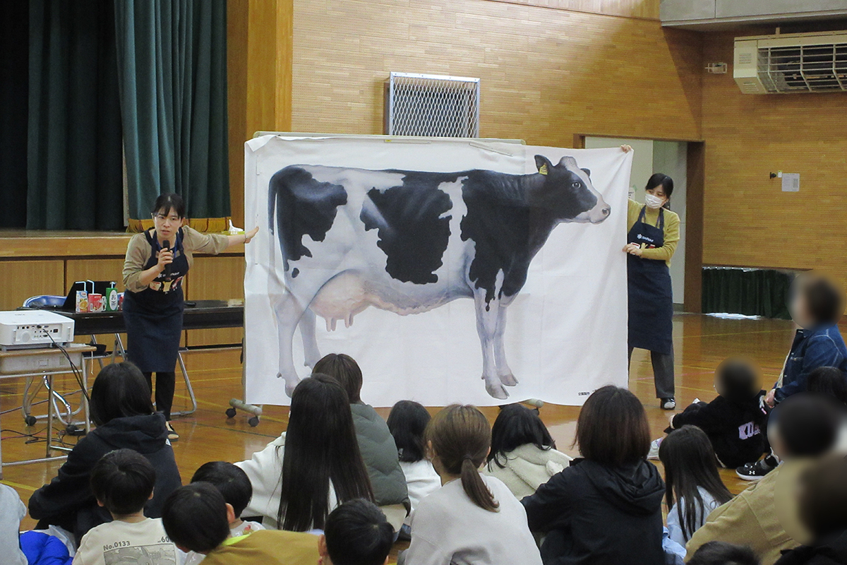 クイズを通して牛の体のしくみや生活、そして牛乳についての基本的な知識を学んだ。牛は大きな体を維持するため、1日に多くのエサと水を必要とし、涼しい環境を好むこと、また睡眠時間が1日およそ3時間と短いことがわかった。さらに、牛には4つの胃があり、草を食べるときに誤って飲み込んだ針金などで体を傷つけないよう、体内に磁石を入れておく処置が行われていることも知ることができた。給食に牛乳が出る理由については、牛乳にカルシウムが多く含まれ、体を元気に保ち、骨や歯をつくり、成長を支える栄養として重要であることを学んだ。お茶やジュースと比べてもカルシウム量が多いこと、またカルシウムは牛乳だけでなく、ヨーグルトやチーズのほか、ししゃも、小松菜、豆腐などからもとれることを確認した。牛乳が学校に届くまでの流れについては、動画を通して、母牛のミルクから始まり、牧場(酪農家)、牛乳工場を経て学校へ届けられる過程を知った。あわせて、牛乳はもともと子牛の成長のための大切な飲み物であり、その恵みを私たちがいただいていることへの理解も深まった。