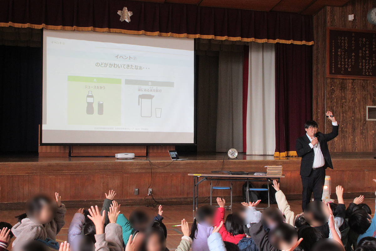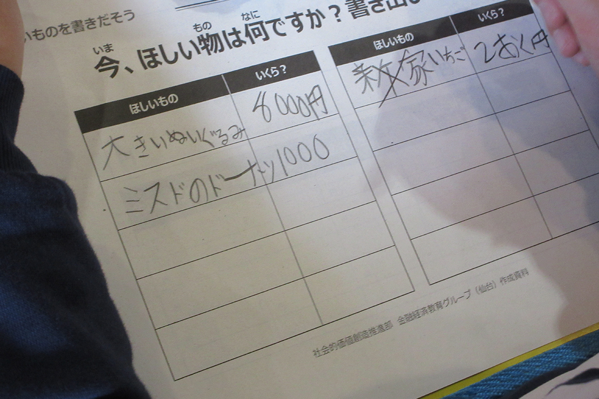 まだ通貨がない時代、自給自足の生活の中で、昔の人は欲しいものは物々交換により手に入れていたことや、約3,000年前の中国では、お金の代わりとして貝殻が使用されていたこと、日本で初めてお金が使われたのは、約1,300年前であるが、現在はお金を持たないキャッシュレスが多くなってきていることなど、昔から現在までのお金の成り立ちについて、クイズを交えながら振り返った。お金には①交換する、②価値をあらわす、③価値をたくわえる、という3つの役割があることや、偽札を作らせないことを目的に、新紙幣が20年ぶりに発行されたことについても学習した。おこづかい体験ワークでは、まず「今欲しいもの」を書き出し、月のはじめに持っているお金から、どのようにすれば目標金額までに貯められるかを考えた。その中で、「出て行くお金」「入ってくるお金」両方の使い方と管理を学んだ。お金は「つかう」ことも「ためる」ことも大事であり、使う際にはよく考える必要があることを理解した。