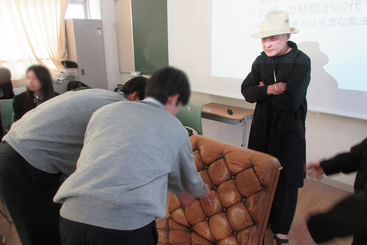 仙台から世界へ発信するだけではなく、世界から仙台に興味・関心を持ってもらうために制作した様々な作品や取り組みを紹介。座ると柔らかく感じる木製の椅子や眺める方向により印象が変わる椅子など、講師がデザインしたオリジナル家具を自由に触れることで、家具や物事の固定概念を取り払った。また、物作りに行き着いた講師自身の半生を振り返りながら、「好きなことはとことんやってみる。明らかに極めてみて、やり切って無理だと思った時は諦めて(見極めて)も良い」こと、「行動をする前に頭で考えすぎて諦めない」こと、「自分を信じられるようになるくらいの経験を積むことが自信につながるため、失敗を怖がらない」ことの大切さなどを学んだ。