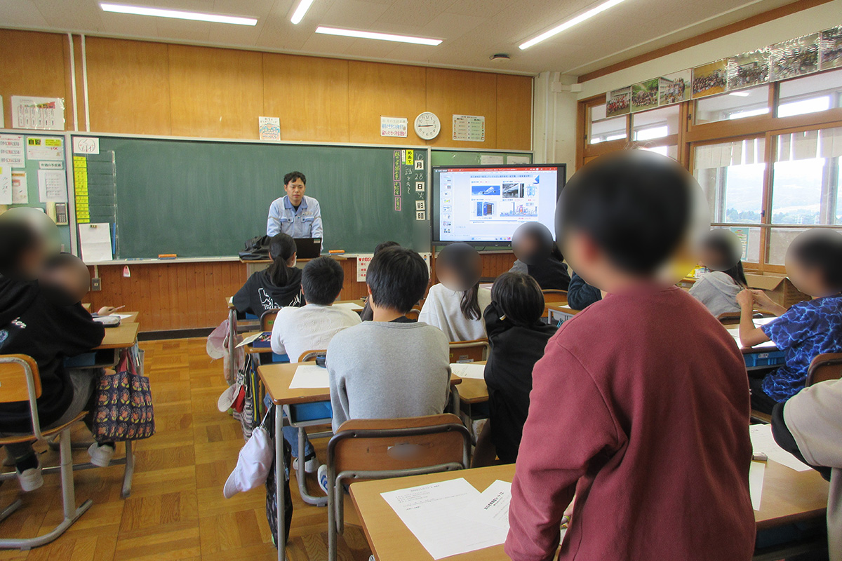 鉄が出来上がる工程について、高炉(鉄鉱石や石炭を溶かして銑鉄にする)・転炉(銑鉄から炭素や不純物を取り除いたり、新たに別の金属を加えたりする)・熱延(鉄に圧力をかけて延ばし、最終的に出荷されていく鋼の板を作る工程)の様子を、動画を通して学習した。日本製鉄で作られている鉄製品(自動車の部品、缶詰飲料缶、家電・住宅設備等)を例に挙げ、鉄は他の素材と比べて圧倒的に使われる量が多いことから、人々の暮らしを支える生活に根差した素材であることを理解した。また、県内の直江津地区にある事業所でチタンを製造していることから、鉄と比べて、軽い(鉄の60%)・強い(鉄の約2倍)・錆びない・色がつくなどの特性を生かしたチタン製品(航空機、船の熱交換器など)についても学び、チタンで作られたタンブラーや名刺入れなど、実際に見て触れて理解を深めた。