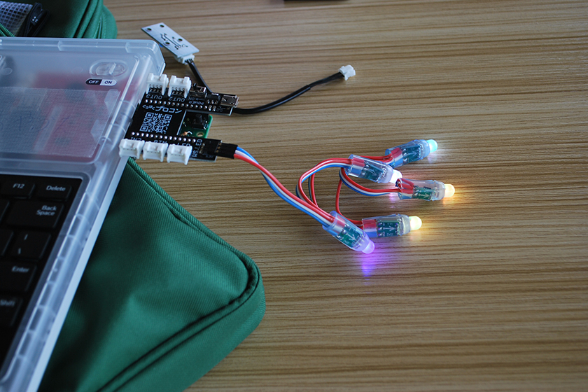 まずは、プログラミング専用子どもパソコンの「IchigoDake」と拡張基板を組み合わせることから始めました。拡張基板とは、コンピュータの機能を拡張するためのもので、荒木さんは体験内容に応じてあらかじめ設定し、大人がサポートする部分の負荷を減らしたり、体験のスムーズな運営につなげたりしています。