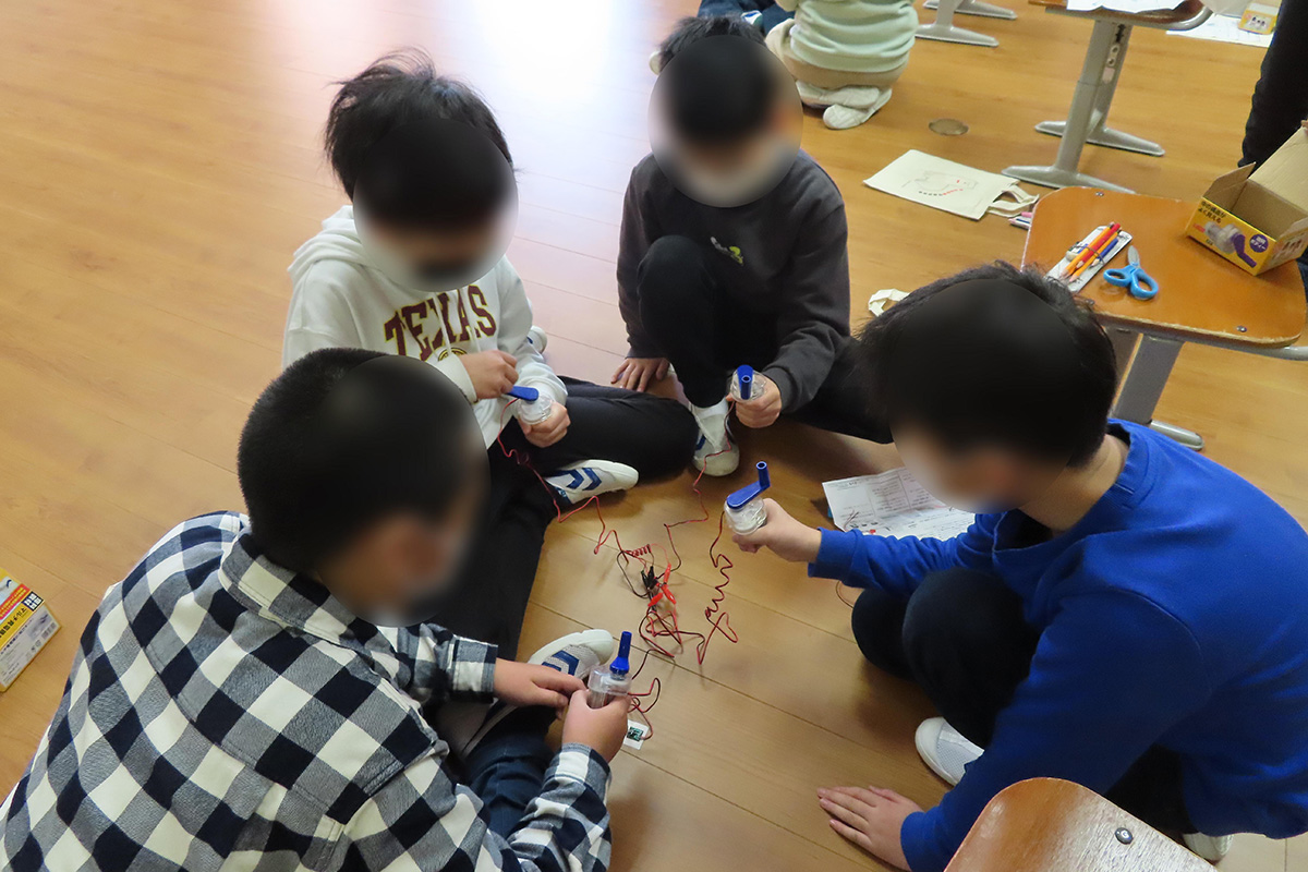 前半の講義では、エネルギーの歴史や電気を作るとはどんなことなのか、電気は動力・熱になるエネルギーや光になるエネルギーがあること、発電所の仕組みや家庭まで電気が届く道のりについて学習した。地球温暖化はどのような影響を及ぼすのか、また、再生可能エネルギーや電気に関わるSDGsを通して、家庭で電気を上手に使うためにはどのようにすればよいかを考えた。後半は「手回し発電機」を組み立て、LEDの点灯や電子オルゴールを鳴らす実験を行い、モーターを回転させることで発電できることを理解した。