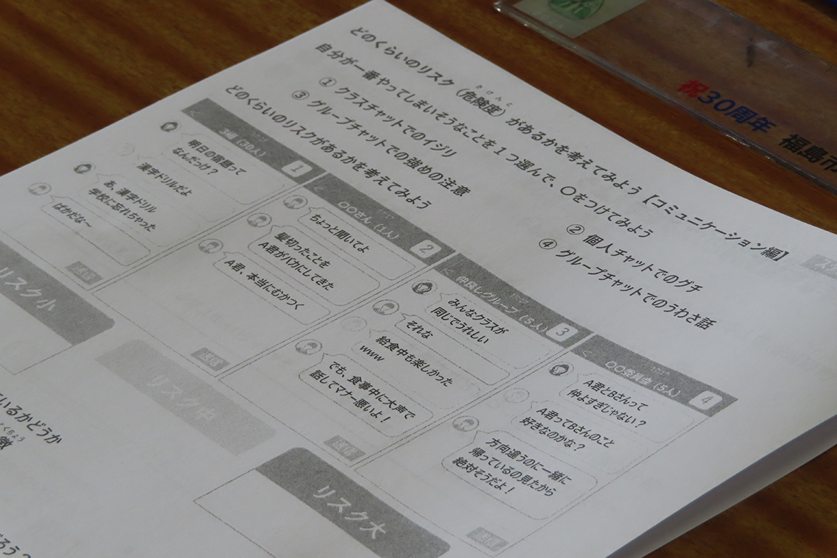 スマホやインターネットに潜むリスク(危険性)について、「リスクの発見」「リスクの見積もり」「リスクへの対応」の3つの段階(リスクを考えるための視点)に分けて考えた。4つの具体的な事例から、「自分に起こりそうなことはどれか」「起こったときの被害の大きさ」について、ワークシートを使って個人で考えた後、グループで話し合い、「自分」と「友だち」のリスクに対する捉え方や感じ方の違いについて理解を深めた。また、悩んだときや困ったときは、ひとりで抱え込まずに周囲の人に相談することの大切さについて学んだ。