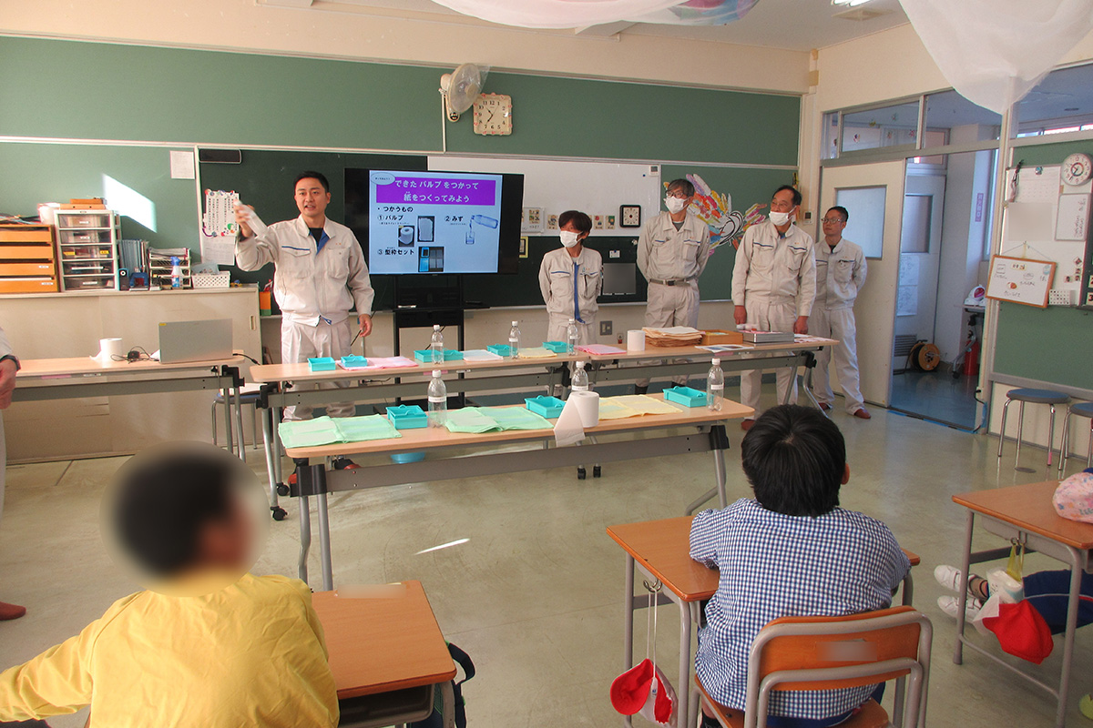 紙は木から作られており、木を細かく砕いた「木材チップ」を、南アフリカ、オーストラリア、チリ、ブラジル、ベトナムなどの海外から船で日本に運んでいることや、工場では木材チップと薬を混ぜて大きな鍋で煮る作業「蒸解(じょうかい)」をすることで、白い「パルプ」(紙のもとになる材料)になることを学習した。クイズや動画を通して紙の製造工程や製紙機械の仕組みについて理解を深めるとともに、実際に木材チップやパルプを固めたものを手に取り、紙の原料を直接確認した。紙をつくる機械は最大で長さ約230メートル、幅約10メートルの大きさであることも紹介された。手すき紙づくり体験では、ペットボトルに水と切ったトイレットペーパーを入れてよく振ったどろどろのバルブに染料を入れて好きな色にしたり、色紙で飾りつけをしたりして、自分だけのオリジナルの紙を作成した。