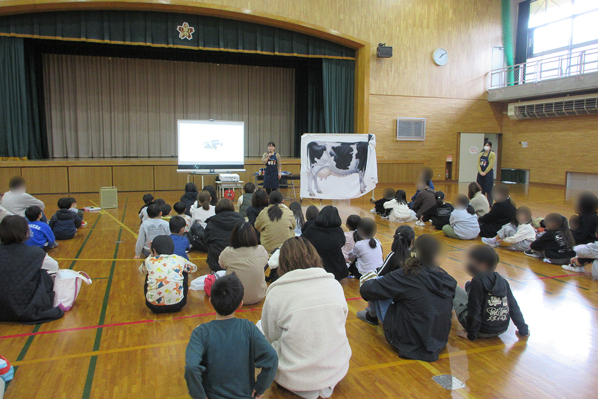 クイズを通して牛の体のしくみや生活、そして牛乳についての基本的な知識を学んだ。牛は大きな体を維持するため、1日に多くのエサと水を必要とし、涼しい環境を好むこと、また睡眠時間が1日およそ3時間と短いことがわかった。さらに、牛には4つの胃があり、草を食べるときに誤って飲み込んだ針金などで体を傷つけないよう、体内に磁石を入れておく処置が行われていることも知ることができた。給食に牛乳が出る理由については、牛乳にカルシウムが多く含まれ、体を元気に保ち、骨や歯をつくり、成長を支える栄養として重要であることを学んだ。お茶やジュースと比べてもカルシウム量が多いこと、またカルシウムは牛乳だけでなく、ヨーグルトやチーズのほか、ししゃも、小松菜、豆腐などからもとれることを確認した。牛乳が学校に届くまでの流れについては、動画を通して、母牛のミルクから始まり、牧場(酪農家)、牛乳工場を経て学校へ届けられる過程を知った。あわせて、牛乳はもともと子牛の成長のための大切な飲み物であり、その恵みを私たちがいただいていることへの理解も深まった。