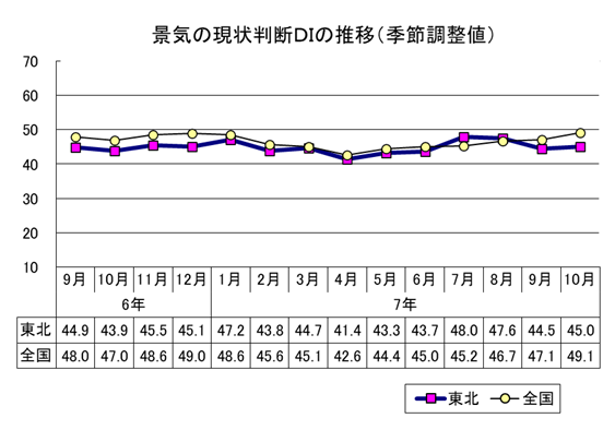 現状判断DIは「45.0」と3か月ぶりに前月を上回った。前月と比較し+0.5ポイント上昇した。
